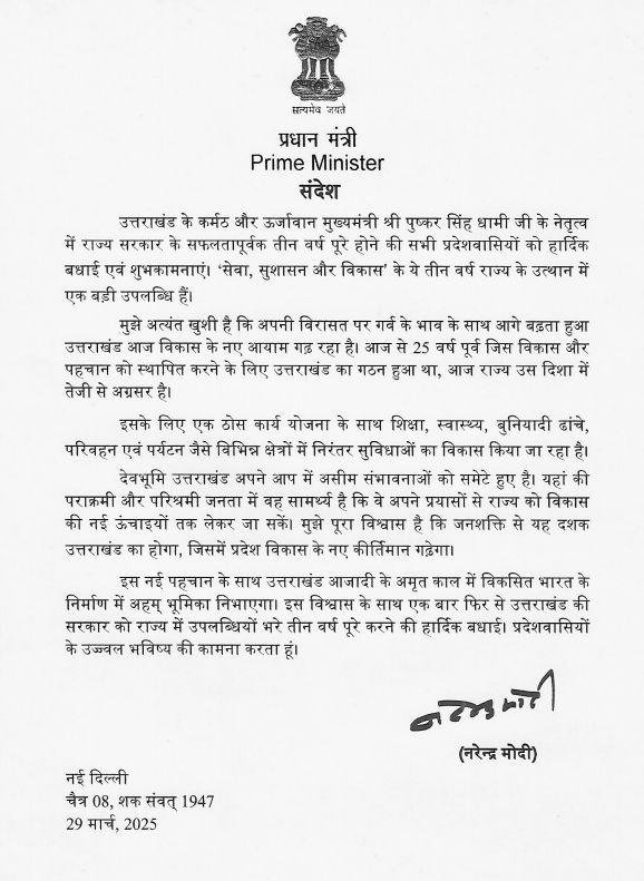 प्रधानमंत्री नरेंद्र मोदी ने अपने बधाई संदेश में कहा है कि उत्तराखंड के कर्मठ और ऊर्जावान मुख्यमंत्री पुष्कर सिंह धामी के नेतृत्व में राज्य सरकार के ये तीन वर्ष ‘सेवा, सुशासन और विकास’ के रूप में समर्पित रहे हैं, जो राज्य के उत्थान में एक बड़ी उपलब्धि है। प्रधानमंत्री ने कहा है कि अपनी विरासत पर गर्व के भाव के साथ आगे बढ़ता हुआ उत्तराखंड आज विकास के नए आयाम गढ़ रहा है। आज से 25 वर्ष पूर्व जिस विकास और पहचान को स्थापित करने के लिए उत्तराखंड का गठन हुआ था, आज राज्य उस दिशा में तेजी से अग्रसर है। इसके लिए एक ठोस कार्य योजना के साथ शिक्षा, स्वास्थ्य, बुनियादी ढांचे, परिवहन एवं पर्यटन जैसे विभिन्न क्षेत्रों में निरंतर सुविधाओं का विकास किया जा रहा है।