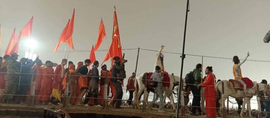 Prayagraj Maha Kumbh में Amrit Snan के लिए निकली अखाड़ों की शोभा यात्रा में कुछ नागा साधु घोड़ों पर सवार थे तो कुछ पैदल चलते हुए अपनी विशिष्ट वेशभूषा और आभूषणों से सजे हुए थे। जटाओं में फूल, फूलों की मालाएं और त्रिशूल हवा में लहराते हुए उन्होंने Prayagraj Maha Kumbh की पवित्रता को और भी बढ़ा दिया। स्व-अनुशासन में रहने वाले इन साधुओं को कोई रोक नहीं सकता था, लेकिन वो अपने अखाड़ों के शीर्ष पदाधिकारियों के आदेशों का पालन करते हुए आगे बढ़े। नगाड़ों की गूंज के बीच उनके जोश ने इस अवसर को और भी खास बना दिया। त्रिशूल और डमरू के साथ उनके प्रदर्शन ने यह संदेश दिया कि Prayagraj Maha Kumbh केवल धार्मिक आयोजन नहीं, बल्कि प्रकृति और मनुष्य के मिलन का उत्सव है।