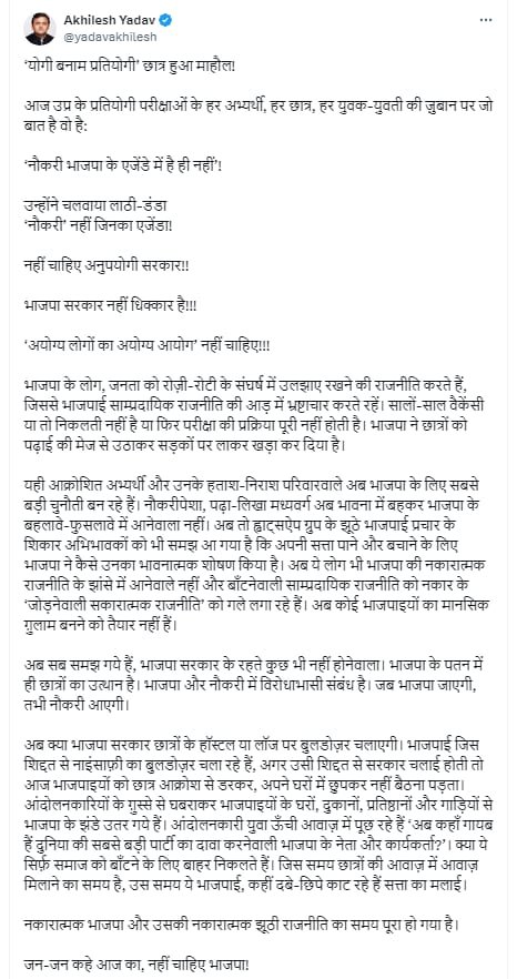 समाजवादी पार्टी के राष्ट्रीय अध्यक्ष अखिलेश यादव ने यूपी लोक सेवा आयोग के बाहर प्रतियोगी छात्रों के दो दिन से चल रहे प्रदर्शन को लेकर सोशल मीडिया प्लेटफार्म `एक्स` पर पोस्ट किया है कि ‘योगी बनाम प्रतियोगी’ छात्र हुआ माहौल! अखिलेश यादव ने लिखा है कि ‘छात्रों की आवाज‘ नौकरी भाजपा के एजेंडे में है ही नहीं’। उन्होंने चलवाया लाठी-डंडा, ‘नौकरी’ नहीं जिनका एजेंडा! नहीं चाहिए अनुपयोगी सरकार, भाजपा सरकार नहीं धिक्कार है। सालों-साल वैकेंसी या तो निकलती नहीं है या फिर परीक्षा की प्रक्रिया पूरी नहीं होती है। भाजपा ने छात्रों को सड़कों पर लाकर खड़ा कर दिया है।