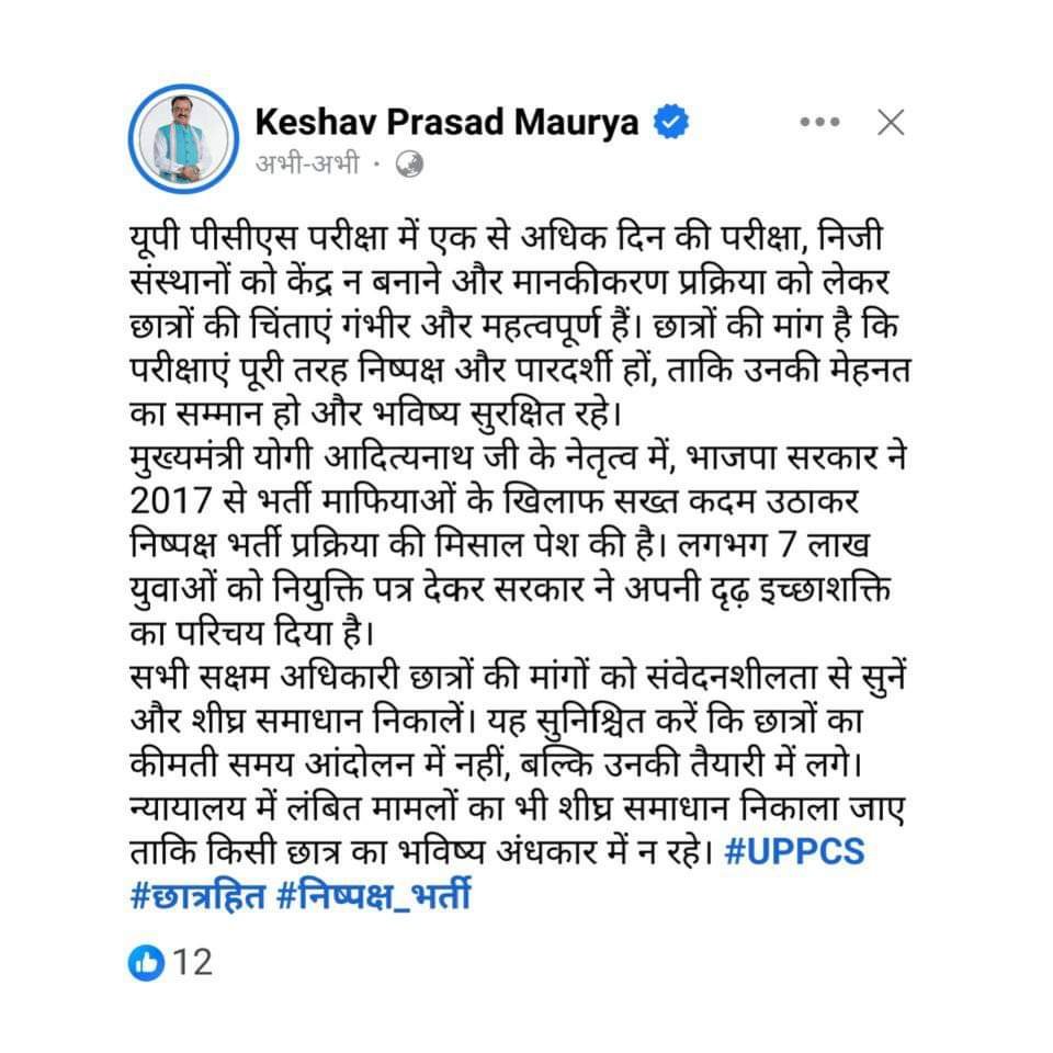 उत्तर प्रदेश के उपमुख्यमंत्री केशव प्रसाद मौर्य ने भी सोशल मीडिया प्लेटफार्म `एक्स` पर लिखा है कि यूपी पीसीएस परीक्षा में एक से अधिक दिन की परीक्षा, निजी संस्थानों को केंद्र न बनाने और मानकीकरण प्रक्रिया को लेकर छात्रों की चिंताएं गंभीर और महत्वपूर्ण हैं। छात्रों की मांग है कि परीक्षाएं पूरी तरह निष्पक्ष और पारदर्शी हों, ताकि उनकी मेहनत का सम्मान हो और भविष्य सुरक्षित रहे। मुख्यमंत्री योगी आदित्यनाथ जी के नेतृत्व में, भाजपा सरकार ने 2017 से भर्ती माफियाओं के खिलाफ सख्त कदम उठाकर निष्पक्ष भर्ती प्रक्रिया की मिसाल पेश की है। लगभग सात लाख युवाओं को नियुक्ति पत्र देकर सरकार ने अपनी दृढ़ इच्छाशक्ति का परिचय दिया है। सभी सक्षम अधिकारी छात्रों की मांगों को संवेदनशीलता से सुनें और शीघ्र समाधान निकालें। यह सुनिश्चित करें कि छात्रों का कीमती समय आंदोलन में नहीं, बल्कि उनकी तैयारी में लगे। न्यायालय में लंबित मामलों का भी शीघ्र समाधान निकाला जाए ताकि किसी छात्र का भविष्य अंधकार में न रहे।